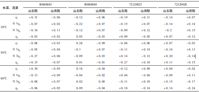 (3)累積體積(標準表法)相對示值誤差測量結果中,山東院在水溫30℃、qi點處與參考值的差值最大,為+0.31%(80888883);山西院在水溫80℃、qp點處與參考值的差值最大,為-0.24%(72120028)。同樣在標準表法中比對樣品在一些試驗點上的測量重復性也不是很好,差值的擴展不確定度最大達到了1.41%。