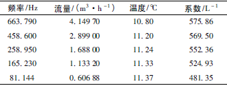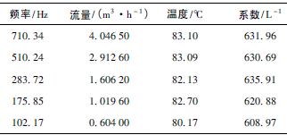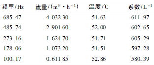 根據上述檢測設備及條件,按照JJG1037—2008《渦輪流量計檢定規程》,在四種不同黏度下各檢定5個點,每點檢定3次,得到的數據如表1~表4所示,數據表中的頻率、流量、溫度、系數均為每點檢定3次各自的平均值。由表1得到儀表線性度為8.9%,儀表系數為528.61L-1;由表2得到儀表線性度為6.3%,儀表系數為553.89L-1;由表3得到儀表線性度為2.6%,儀表系數為596.18L-1;由表4得到儀表線性度為2.2%,儀表系數為622.44L-1。