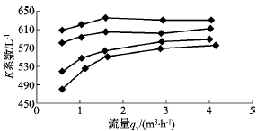 另外,從表1~表4均可看出,流量計黏度的變化對流量最小點影響也比較大,在四種不同黏度下,系數都在流量最后一點時發生了明顯的下降;而且黏度最大為93.24cSt時,系數從524.93L-1變為481.35L-1,系數下降了43.58L-1;黏度為7.16cSt時,系數從620.88L-1變為608.97L-1,系數僅下降了11.91L-1。從中可看出,隨著黏度的變小,對流量計下限的影響也越來越小。黏度變化對渦輪流量計特性曲線的影響如圖2所示。圖2中特性曲線從下至上依次對應表1、表2、表3和表4,儀表系數隨著黏度的升高而下降,用于較高黏度時,儀表系數與流量之間不再保持線性關系,因此,渦輪流量計測量高黏度時,必須根據黏度和流量進行修正。圖2中特性曲線的擬合公式為: