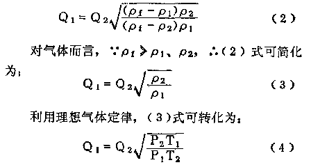 如果兩種不同密度ρ1、ρ2的介質(zhì)分別通過同臺轉(zhuǎn)子流量計(jì)時(shí),若浮子平衡在同一位固上,由(1)式得轉(zhuǎn)子流量計(jì)密度換算的基本式: