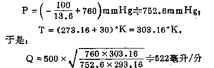 例:使用某空氣采樣儀,運(yùn)行時(shí),采樣儀上轉(zhuǎn)子流量計(jì)讀數(shù)為500毫升/分,測表前壓為—100mmH 20(因使用抽氣泵,所以是負(fù)壓),現(xiàn)場溫度為30℃,求此時(shí)空氣的實(shí)際流量值。