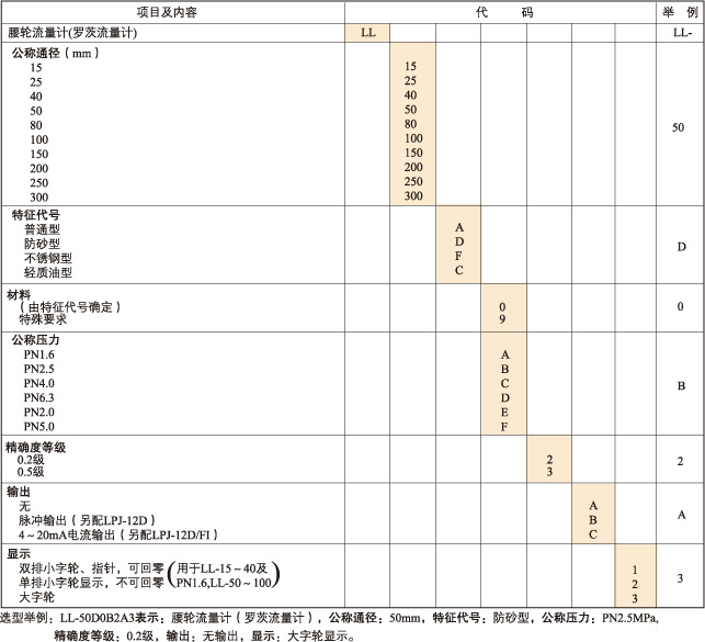 四、由選定的公稱通徑、基本誤差值(等級精度)和公稱壓力,按照“選型編碼”的內容,選定流量計型號。